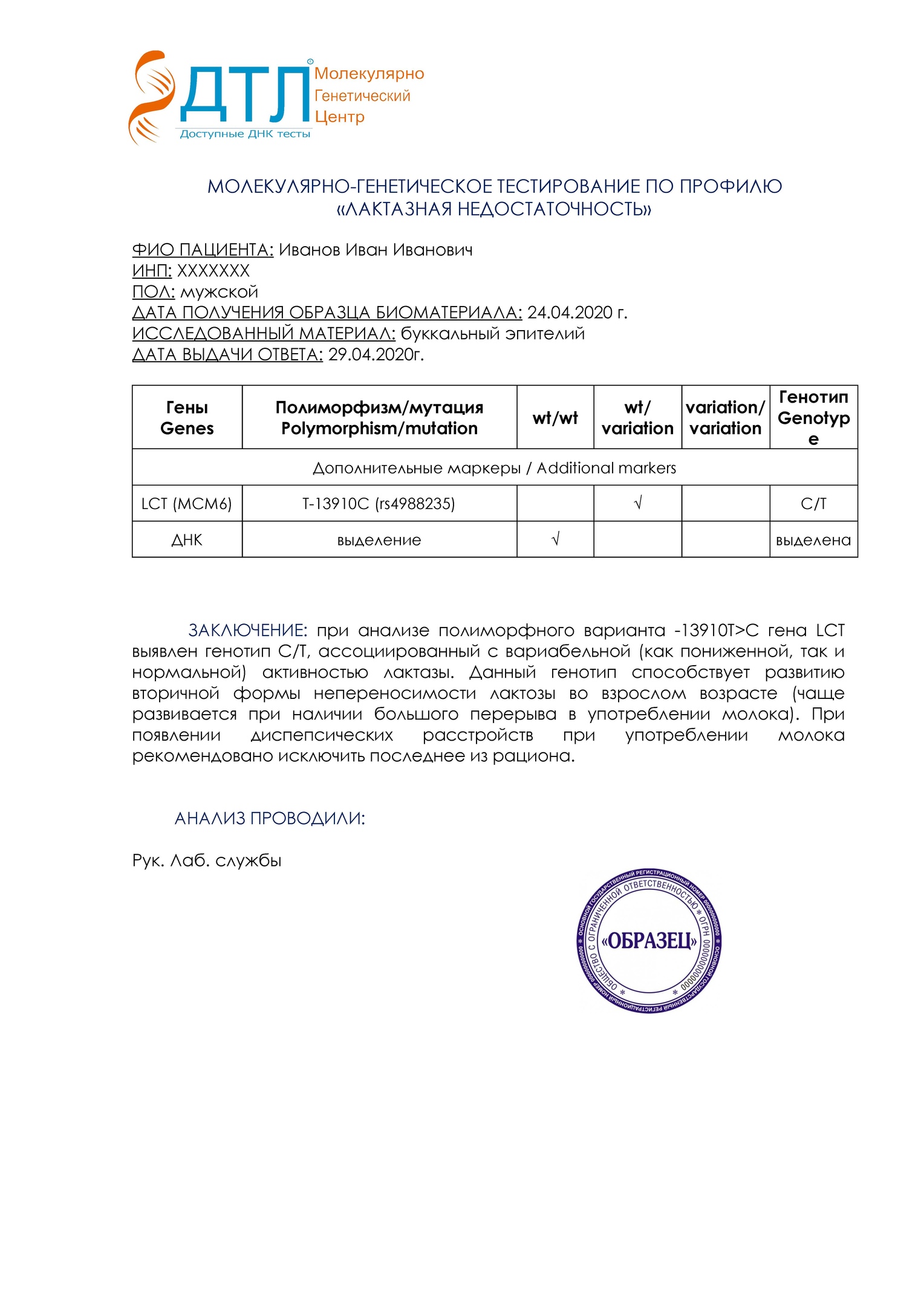 ДНК анализ на лактозную недостаточность относится к группе персональных тестов на непереносимости. В результате исследования вы получите четкий ответ, если у вас генетическая предрасположенность к непереносимости лактозы. Если проблема с усваиванием молока, творога и других молочных продуктов обусловлена не генами, то можно назначить необходимое лечение. Это даст возможность снова в полной мере наслаждаться любимыми продуктами.