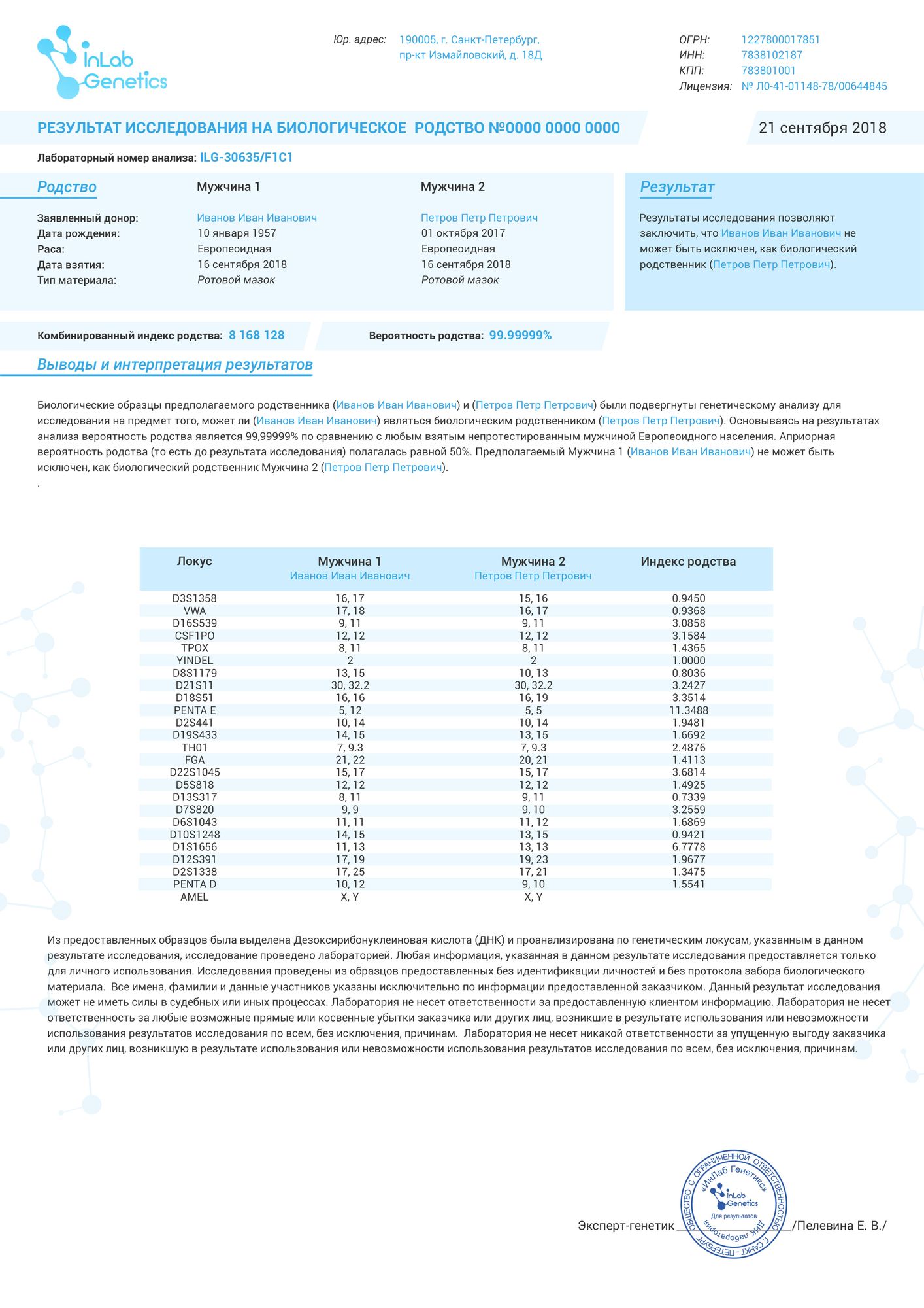 Для независимого контроля лаборатория проводит анализ по Y-хромосоме параллельно двумя разными группами специалистов. Затем результаты заверяются подписью заведующего лабораторией и печатью.